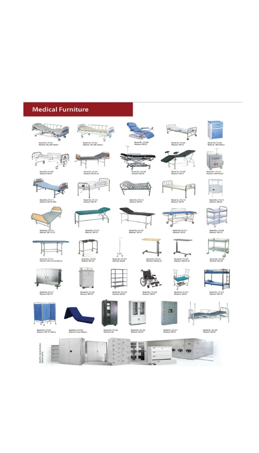 Hospital Bed, Bed side locker, Examination Table, Gyne Table, Medicine Trolley, Instrument Cabinet, Waste Trolley, Food Trolley, Waiting Chair, Wheel Chair, Bed side Screen, overbed table, File cabinet, Steel Almirah, Storage Rack
